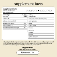 - Includes: 3 tins of Functional Mushroom Chocolates -1 Brainstorm - 1 Happy Ending - 1 Nightcap How to dose: enjoy one square of brainstorm and happy ending each day and one square of nightcap in the evening. taken daily, the active ingredients will compound over time and give you the full spectrum of benefits from each formula so you can feel your best.