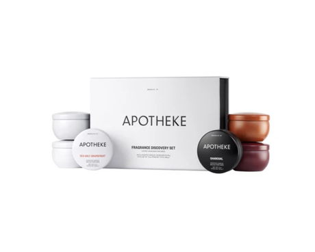 An exclusive discovery set of six mini scented candle tins featuring four year-round bestselling APOTHEKE fragrances, including Charcoal, Bergamot Tangerine, Sea Salt Grapefruit, and White Vetiver, plus Pumpkin Ginger and Bitter Cherry.