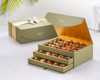 The Palm chest drawer is crafted using recycled paper material, perfect as a sustainable gifting choice. Inspired by the natural colour tones and texture of the date palm leaves, it presents a classic and fresh design. The packaging highlights a green woven silk texture and features a luxurious shiny gold interior. Each chest drawer is complemented with an elegant ribbon for a stylish finish.