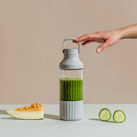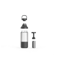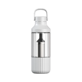 Glass water bottle that includes infuser to infuse your water with fresh, natural ingredients. Remove the Infusion Chamber to take your smoothie on the go. Holds up to 750mL. Made of borosilicate glass, stainless steel, silicone, PP, and TPE.