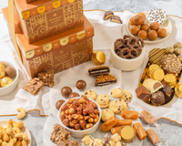 Elevate any celebration with this stunning 3-tier gift tower, a decadent display of chocolate delights and sweet treats. Wrapped in rich brown and shimmering gold, this elegant tower is as much a feast for the eyes as it is for the taste buds. Each tier unveils a new treasure from luxurious Belgian truffles to chocolate toffee bites, silky caramels and so much more. This set includes Chocolate Covered Oreos, Hot Cocoa Pretzles, Chocolate Chip Cookie Crisps, Ultimate Malt Balls, Rocky Road Popcorn Clusters, Praline Peanuts, Slated Cashews, Chocolate Peanut Butter Cups, Belgian Chocolate Truffles, Toffee Bites, Foiled Milk Chocolate Balls, Sea Salt Caramels, and Prosecco Cordials.