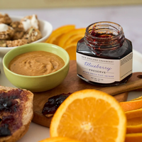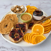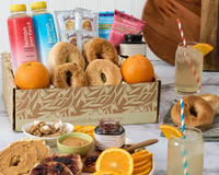 - Oranges Qty. 2 - Original Lemon Water by Lemon Perfect 12 oz - Dragonfruit Water by Lemon Perfect 12 oz - Blueberry Preserves by New England Cranberry 4.5 oz - Assorted Nut Butter by Justin's - single serve pouch Qty. 4 - Strawberry-Mallow Granola Bites by B'cuz 1 oz - Blueberry Lemon Granola Bites by B'cuz 1 oz - Sesame Bagel by GourmetGiftBaskets.com 4 oz - Cinnamon Raisin Bagel by GourmetGiftBaskets.com 4 oz
