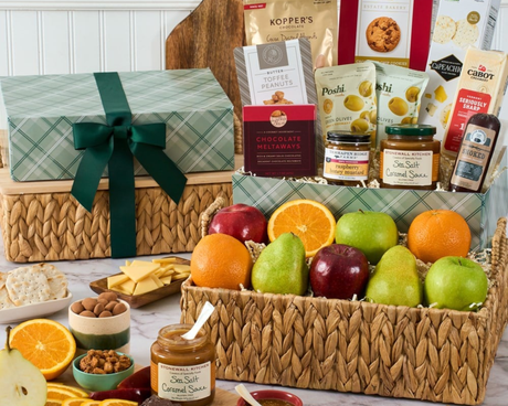 The Local Harvest Fruit Gift Box combines crisp, juicy, delicious fruit with indulgent gourmet snacks. With carefully selected high-quality fruits for the gourmet gifts. In addition to the fruit, it also includes creamy cheeses and artisan crackers to create the perfect gift for your recipient. Give the gift of wholesome, natural decadence with this fruit gift today.