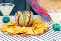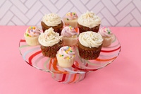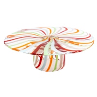 This reversible glass cake plate makes a beautiful presentation for desserts, finger foods, cheeses and confections. It’s made of clear glass with solid multi color stripes. Not only does it serve as a cake plate, flip it over to use as a chip and dip platter. A multi-use piece that also serves as art for your buffet or table.
