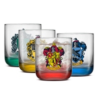 This set of 4 short drinking glasses proudly showcases the iconic Hogwarts house crests— Gryffindor™, Hufflepuff™, Ravenclaw™, and Slytherin™—each accented by a bold house-colored base. Designed for fans who value charm and craftsmanship, these 10oz glasses are perfect for everyday drinks, from juice and soda to special toasts with friends and family.