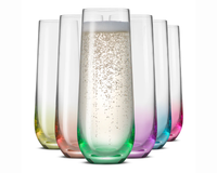 - Set of 6 Colored Champagne Glasses - Capacity: 9.5 oz - Lead-Free Glass - Easy to Grip, Slim Bowl with Flat, Stable Base - Weighted Base - Handwash Only - Suggested to Wash Before First Use