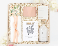 The Bloom Box features an indulgent mix of relaxation essentials. Given as a bridesmaid proposal, thank you gift, or sweet gesture. Box includes: Lavender bath salts in a glass jar from Lavende, Pink Ceramic Candle from Illume in Coconut Milk Mango, Rosehip & Clay facial mask from Formulary 55, and Honey Bath Bar from Nash & Jones, Vanilla Shortbread cookies by Rustic Bakery, and non-alcoholic Champagne Gummies wrapped in floral paper.