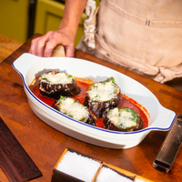 This Bakeware begins with a 202-year-old recipe held secret by skilled artisans in the Loire Valley. The finest and most precious of all bakeware materials, it is also the most demanding to produce. Kanolins, clays, quartz, and feldspars are mixed, shaped, enameled, and baked three times for over 50 hours at temperatures exceeding 2500F. Between bakes, a decorative rim is hand-applied. Porcelain provides a naturally non stick surface and even heating, ensuring crisp corners and gooey middles without over or underbaking. This dish is microwave- and oven-safe to 650F and thermal shock resistant, meaning it can go from freezer to oven to table.