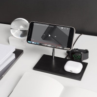 Your all-in-one power solution. Snap your iPhone 12/13/14/15 to the magnetic stand, drop your AirPods or AirPods Pro in the wireless tray, and place your Apple Watch on our detachable puck for seamless everyday power. Designed with your everyday ease in mind with an adjustable head for flexible access to your iPhone while charging.