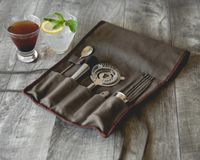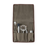 Perfect for the roaming mixologist, the 10-piece Bar Tool Roll Up Kit is a highly-portable and packable waxed-canvas roll-up bar tool set. Waxed canvas roll up storage pouch. Includes stainless steel jigger, muddler, strainer, cocktail spoon, corkscrew, and 4 cocktail picks.
