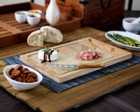 Modern and natural lines merge with the Icon, a beautiful rectangular glass cutting board made from rich parawood and bamboo with a tempered glass tray. Features a carved-out section to snugly secure the included stainless steel fork-tipped cheese knife with a wooden handle. You can also use this handsome cutting board set as a cheese board or serving tray.