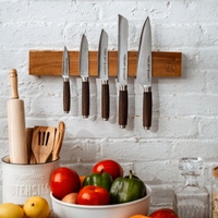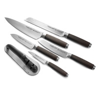 - Includes: 8" Bread Knife (bread, pastries), 8" Chef Knife (fruits, vegetables, meat, herbs), 6" Hocho Knife (vegetables, fish, meat), 5" Santoku Knife (fruits, vegetables, meat, fish), 3.5" Paring Knife (small fruits, small vegetables, herbs), two-stage sharpener, cork Midtown universal storage block - Dimensions: 9" W x 3.5" D x 9.5" H (storage block) - Blade Steel: 65-layer Japanese VG10 - Blade Hardness: 60 +/- HRC - Blade Angle: 18° each side - Construction: Fully forged - Handle Material: Eco-friendly coconut resin - Origin: Made in Solingen, Germany