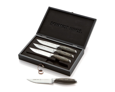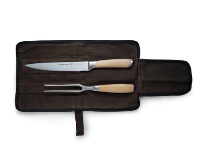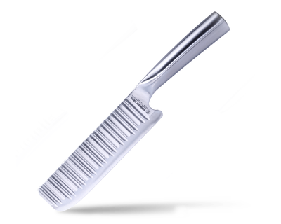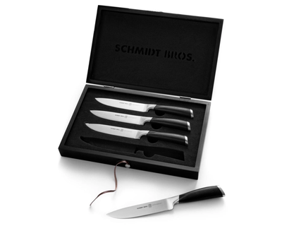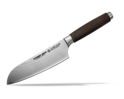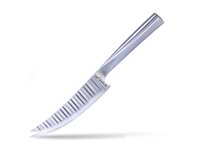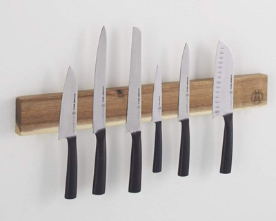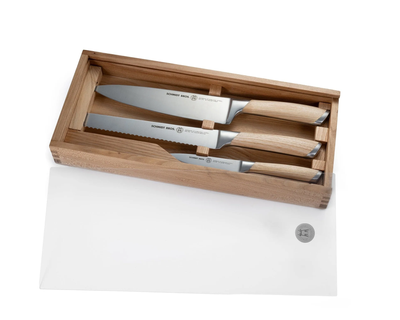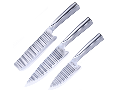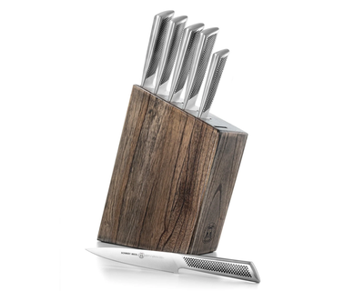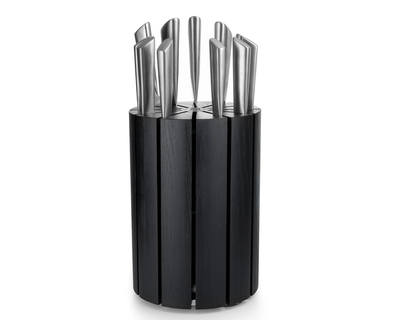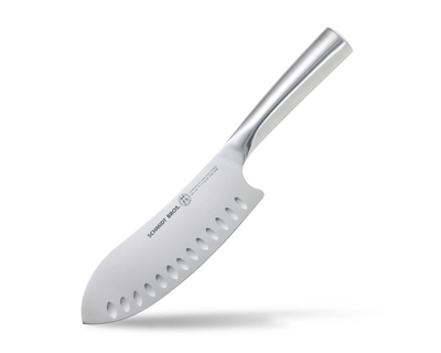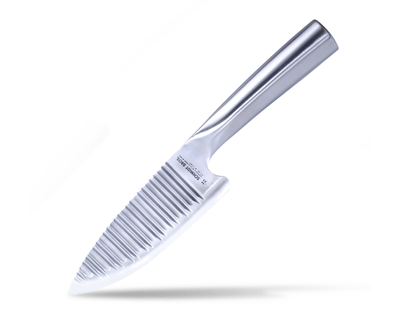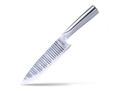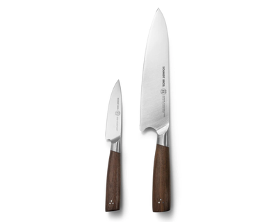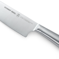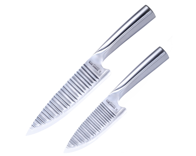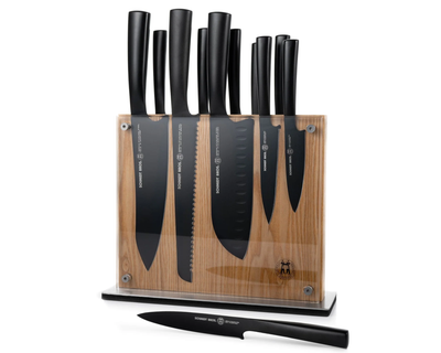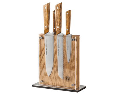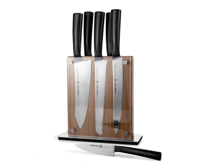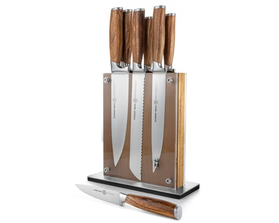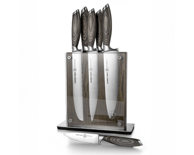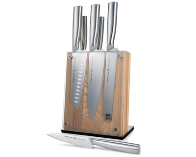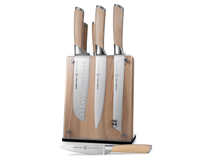 - What's Included: 8" Chef Knife, 8" Bread Knife, 7" Santoku Knife, 5" Fine Edge Utility Knife, 5" Serrated Utility Knife, 4" Paring Knife, White Ash Knife Block - Uses: Fruits, Vegetables, Meat, Herbs (8" Chef), Bread, Pastries, Melons (8" Bread), Fruits, Vegetables, Meat, Fish (7" Santoku), Fruits, Vegetables, Meats (5" Fine Edge Utility), Bread, Pastries, Cheese, Tomatoes (5" Serrated Utility), Small Fruits, Small Vegetables, Herbs (4" Paring) - Blade Hardness: 59 +/- HRC - Blade Angle: 18° each side - Construction: Full Tang - Blade Steel: 100% German DIN 1.4028 - Handle Material: Stainless Steel / Two-Toned