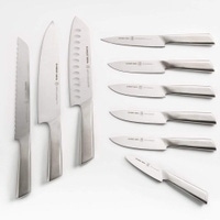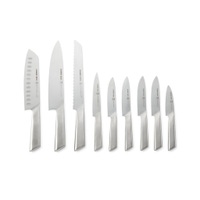 - Includes: 8" bread knife, 8" chef knife, 7" santoku knife, 5" serrated utility knife, 3.5" paring knife, (4) 4.5" steak knives, acacia Borough block - Dimensions: 11.5" W x 3.5" D x 9.5" H (Block) - Use: Bread and pastries (bread knife), fruits, vegetables, meat, and herbs (chef knife), fruits, vegetables, meat, and fish (santoku knife), bread, pastries, and cheese (serrated utility knife), small fruits and vegetables (paring knife), steak, chops, and poultry (steak knives) - Blade Hardness: 59 ± HRC - Blade Angle: 18° per side - Construction: Full tang - Blade Material: 100% German DIN 1.4116 steel - Handle Material: Stainless steel
