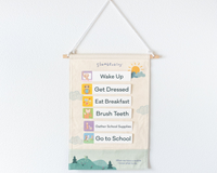- Wall hanging Measures 14" wide x 20" long. - Tiles measure 8.5" x 1.8" - Features 18 tiles, including 4 write-in tiles. - Tiles are made of a heavy-weight card stock with velcro pre-applied on back for easy application. - Titles included: Wake Up, Get Dressed, Eat Breakfast, Brush Teeth, Pack Up, School, Home, Eat snack, Outside Time, Bath Time, Play Time, Eat Dinner, PJs On, Story Time, 4 blank write-in tiles