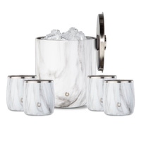 Make an elegant addition to your barware assortment with this double walled and insulated stainless steel ice bucket. Paired with it are four color coordinated rocks glasses that are insulated to keep ice from melting and are sweat free so they are ideal for entertaining. The ice bucket includes a lid and set of tongs and it's unique lid design saves space and protects surfaces from scratching.