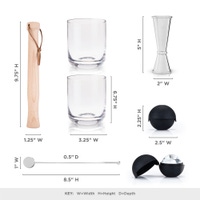 - Included in the set: Two lead-free crystal tumblers, Double-sided stainless steel jigger, Wood muddler, Stainless steel stir stick, and Two round ice molds