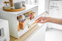 This steel kitchen bread box is designed to streamline and simplify any kitchen. It features plenty of interior space for multiple loaves, buns, and brioches as well as jams and jellies. Small gaps along the hinges provide optimal airflow to keep your bakes fresh and scrumptious. Voted Best Large Capacity Bread Box by the Food Network in 2024! Measures L 14.37 x W 16.93 x H 9.45 inches.