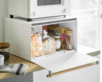 - A simple magnet along the top keeps the lid closed. - Hinge along the bottom allows for minimal airflow to prevent condensation and mold. Not airtight. - Flat-top design allows the top to be used for storage or as a place for a small appliance, such as a coffeemaker or a toaster oven.