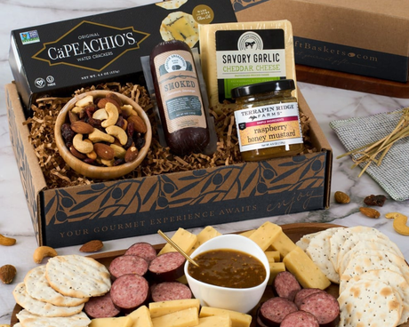 Inside a beautiful two-handled seagrass basket, your recipient will discover a stunning arrangement of freshly harvested orchard fruits, including crisp apples, juicy oranges, and sweet pears, nestled amongst coveted gourmet foods. Complete with irresistible snacks, like classic farmhouse cheddar cheese, cookies, gourmet jam, and sea salt caramel sauce.