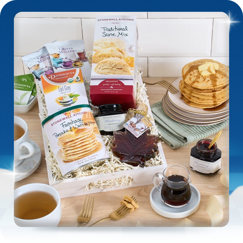 Inside this gift, your recipient will discover New England tea and coffee, New Hampshire maple syrup, a traditional New England buttermilk pancake mix, wild Maine blueberry jam, and a delicious scone mix. Now, anyone can enjoy a North Country breakfast no matter where they are.